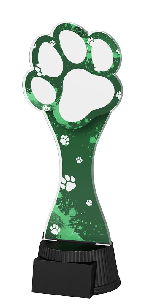 Acryltrophäe mit Druck. Doppelseitiger Druck. Preis ohne Schildchen. Acrylmotiv. Stärke 0.6 cm. Sockel Schwarz. Höhe der Trophäen sind Orientierungsbeispiele.