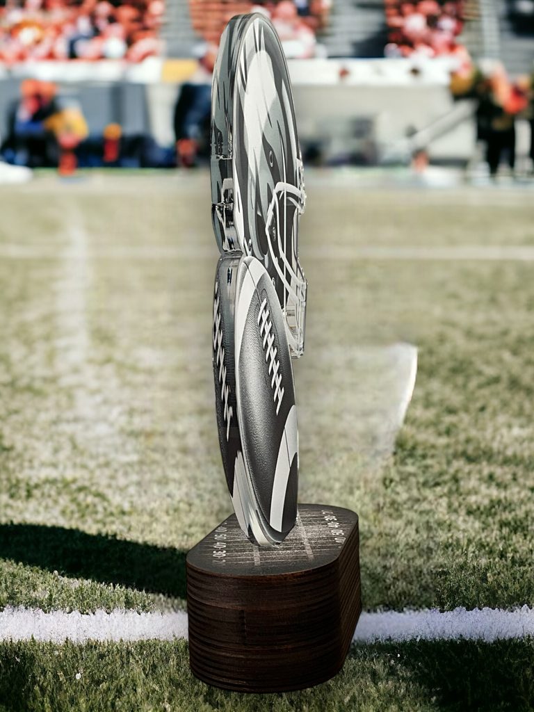 Acryltrophäe mit Holzsockel und UV-Druck. Der Preis der Trophäe beinhaltet nicht den Preis des Etiketts.