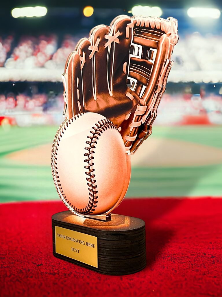 Acryltrophäe mit Holzsockel und UV-Druck. Der Preis der Trophäe beinhaltet nicht den Preis des Etiketts.