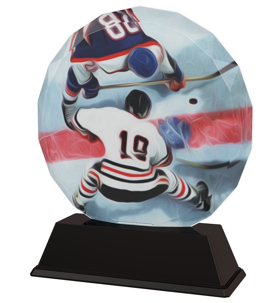 Trophäe aus Acryl. Einseitiger Druck. Dicke 0,8 cm. Der Preis der Trophäe beinhaltet nicht den Preis des Etiketts. Schwarzer Plastiksockel.