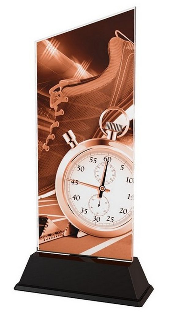 Acryltrophäe mit Druck. Einseitiger Druck. Preis ohne Schildchen. Acrylmotiv. Stärke 0.4 cm. Sockel Schwarz. Höhe der Trophäen sind Orientierungsbeispiele.