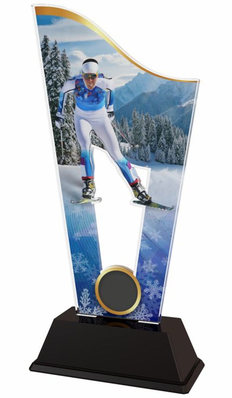 Acryltrophäe mit Druck. Einseitiger Druck. Preis ohne Schildchen. Acrylmotiv. Stärke 0.4 cm. Sockel Schwarz. Höhe der Trophäen sind Orientierungsbeispiele.