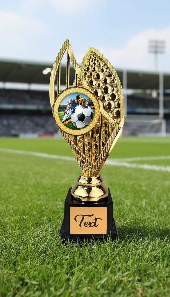 Stilvolle Trophäe in den Farben Gold, Silber oder Bronze, Höhe 31 cm. Design-Emblem mit Sportmotiv in höchster Druckqualität mit Lackierung. Möglichkeit zur Ergänzung eines Schildes nach Ihrer Wahl.