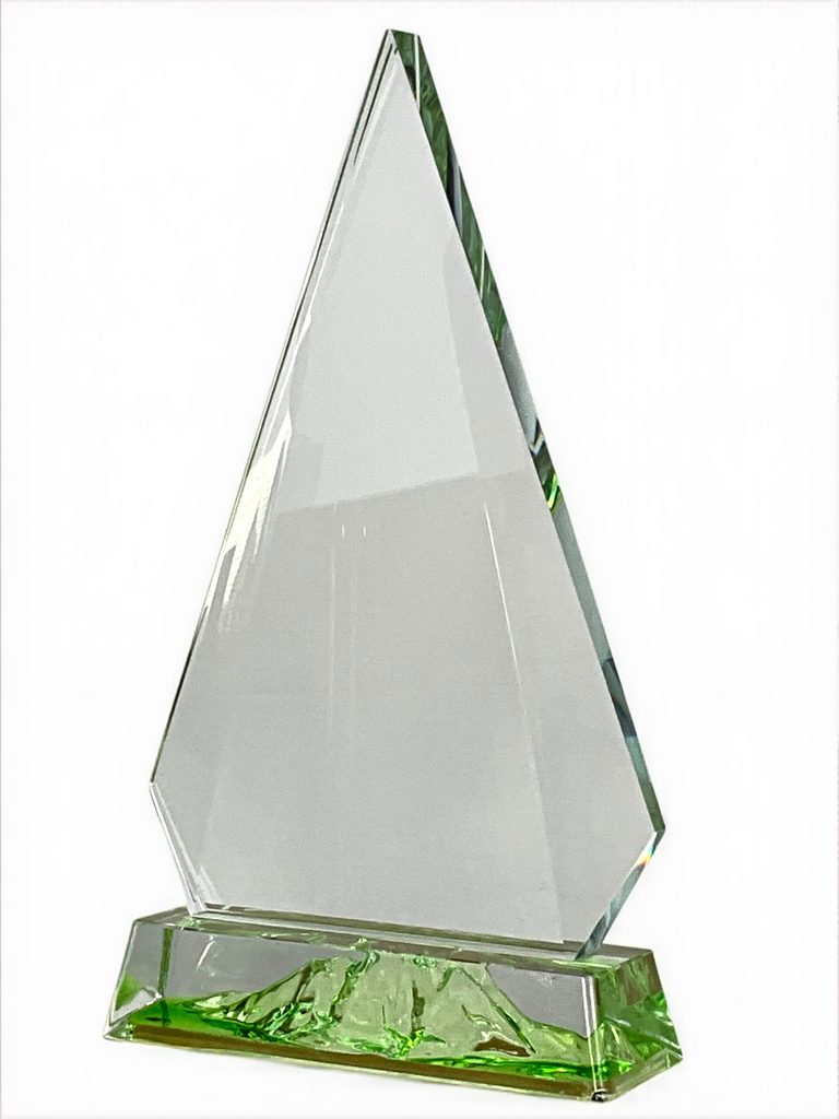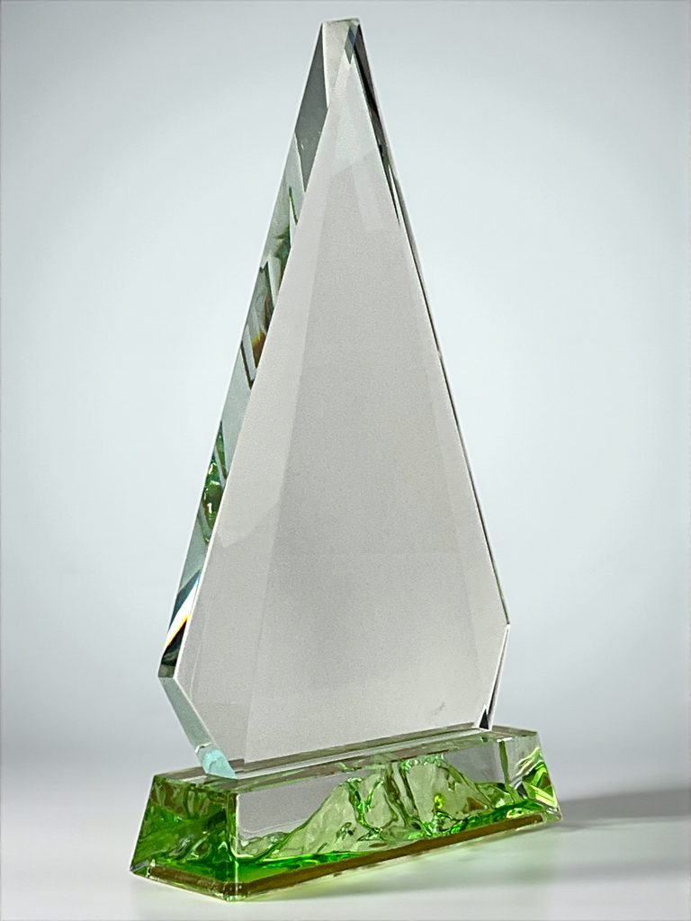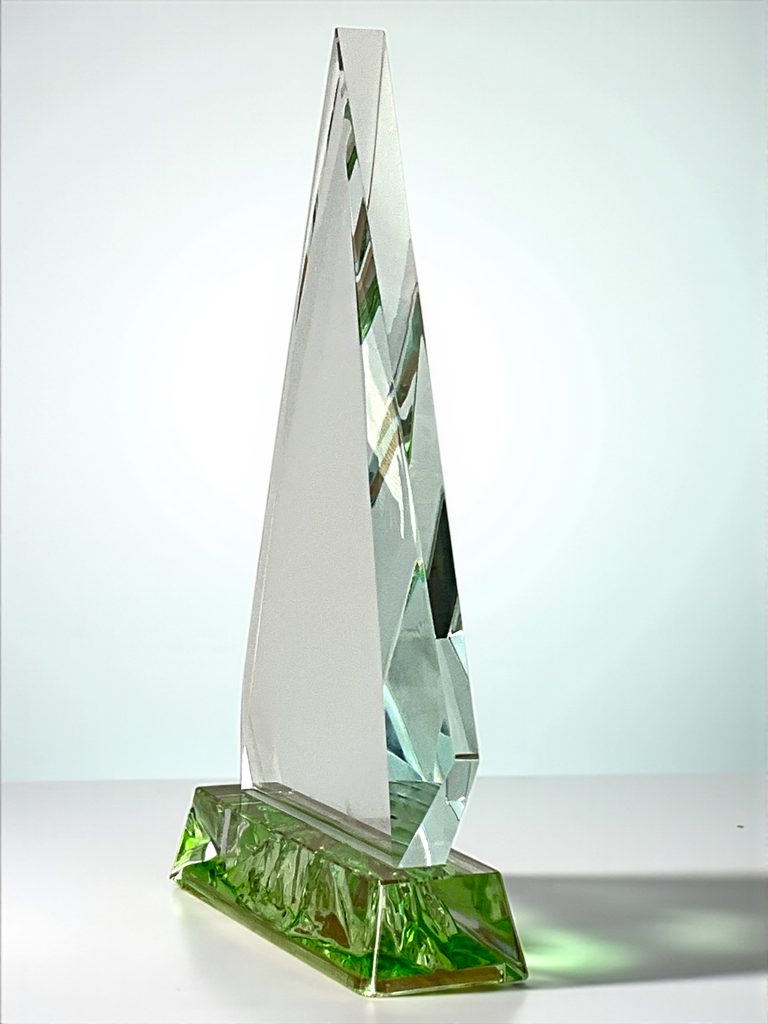 Elegante Glastrophäe in Top-Form mit 1,5 cm dickem Glas und stilvollem grünen Sockel. Ideal für die Auszeichnung von Leistungen, personalisierbar nach Ihren Wünschen.