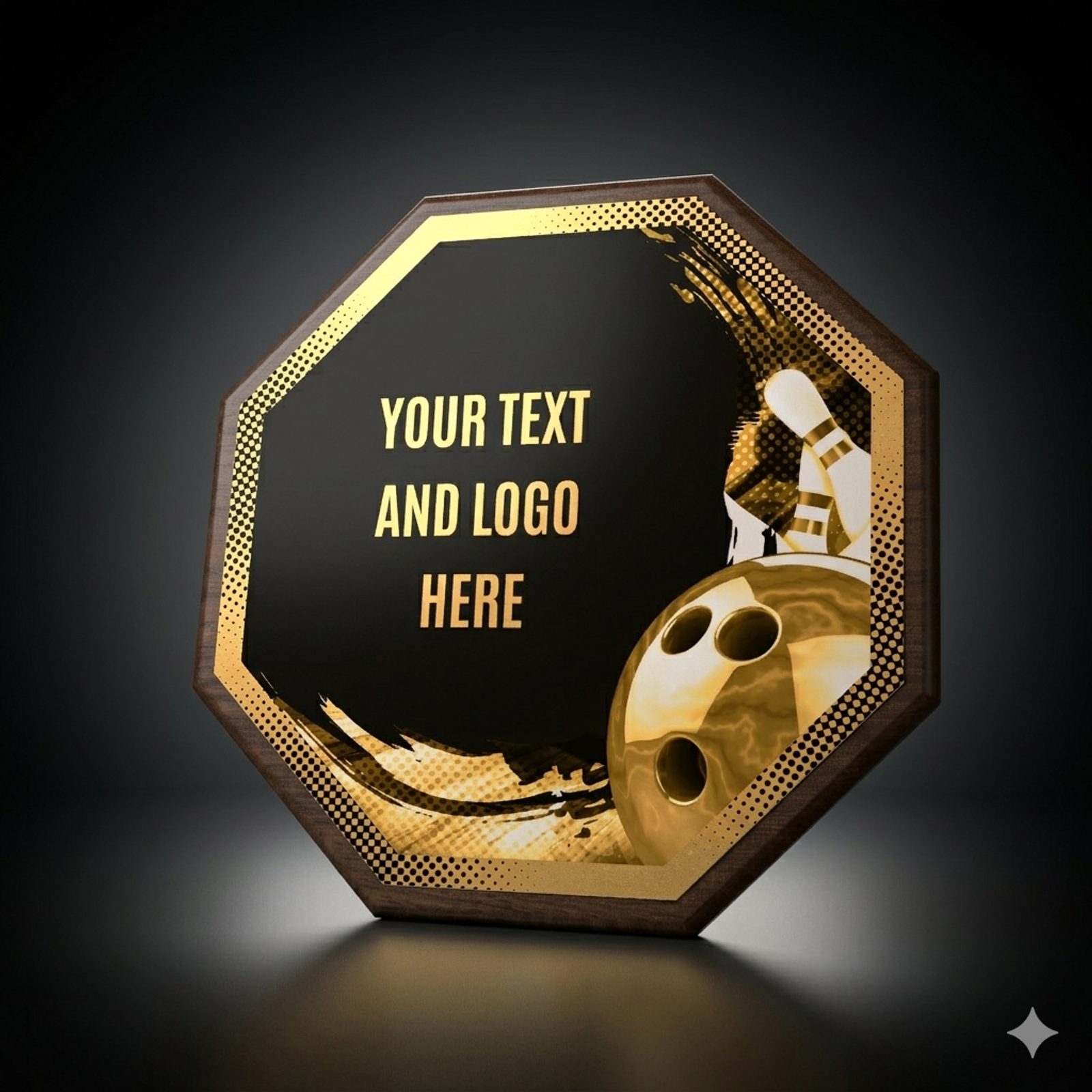 Eine stilvolle Auszeichnung, die eine Holzplakette mit einem Durchmesser von 26 cm und einer Stärke von 1,5 cm mit einem markanten Design-Zentrum (Durchmesser 24 cm) aus Metall kombiniert, veredelt mit UV-Druck und Effektlack.