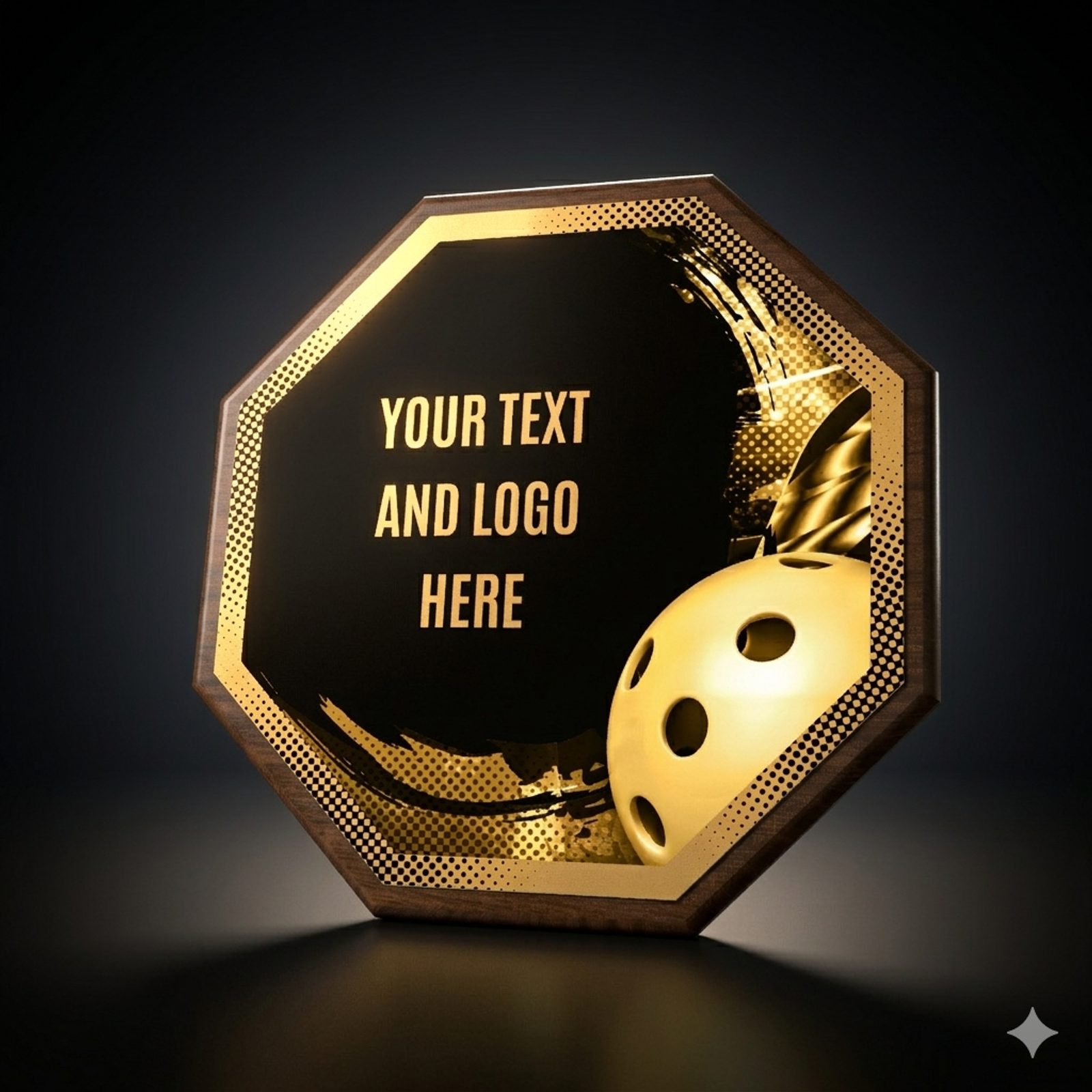 Eine stilvolle Auszeichnung, die eine Holzplakette mit einem Durchmesser von 26 cm und einer Stärke von 1,5 cm mit einem markanten Design-Zentrum (Durchmesser 24 cm) aus Metall kombiniert, veredelt mit UV-Druck und Effektlack.