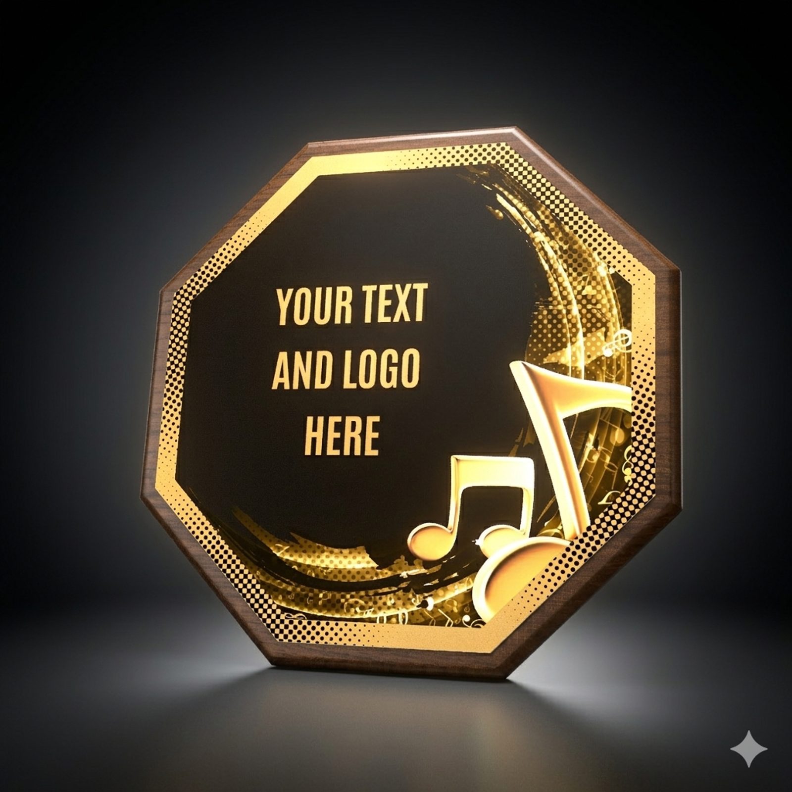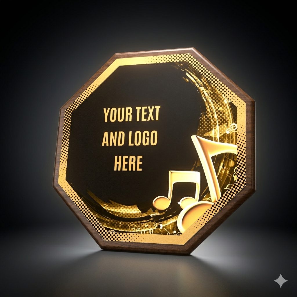 Eine stilvolle Auszeichnung, die eine Holzplakette mit einem Durchmesser von 26 cm und einer Stärke von 1,5 cm mit einem markanten Design-Zentrum (Durchmesser 24 cm) aus Metall kombiniert, veredelt mit UV-Druck und Effektlack.