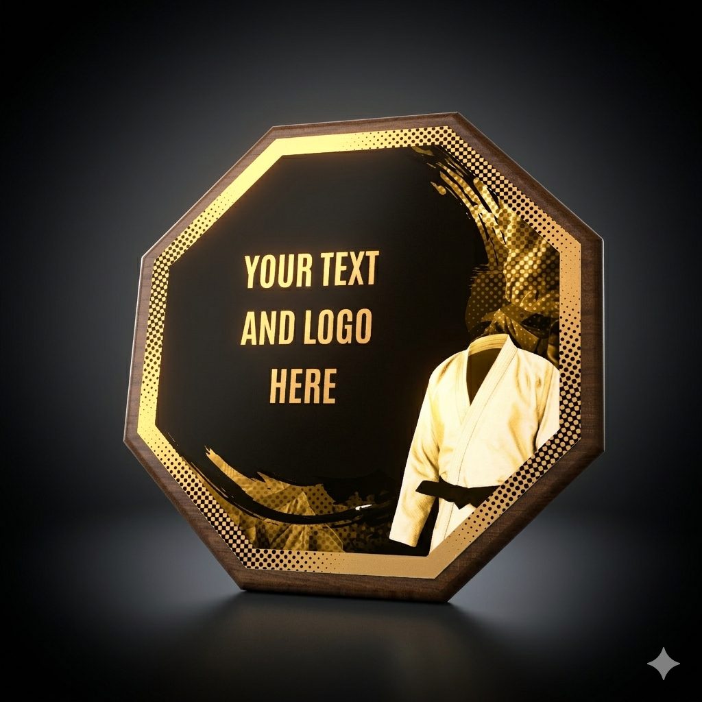 Eine stilvolle Auszeichnung, die eine Holzplakette mit einem Durchmesser von 26 cm und einer Stärke von 1,5 cm mit einem markanten Design-Zentrum (Durchmesser 24 cm) aus Metall kombiniert, veredelt mit UV-Druck und Effektlack.