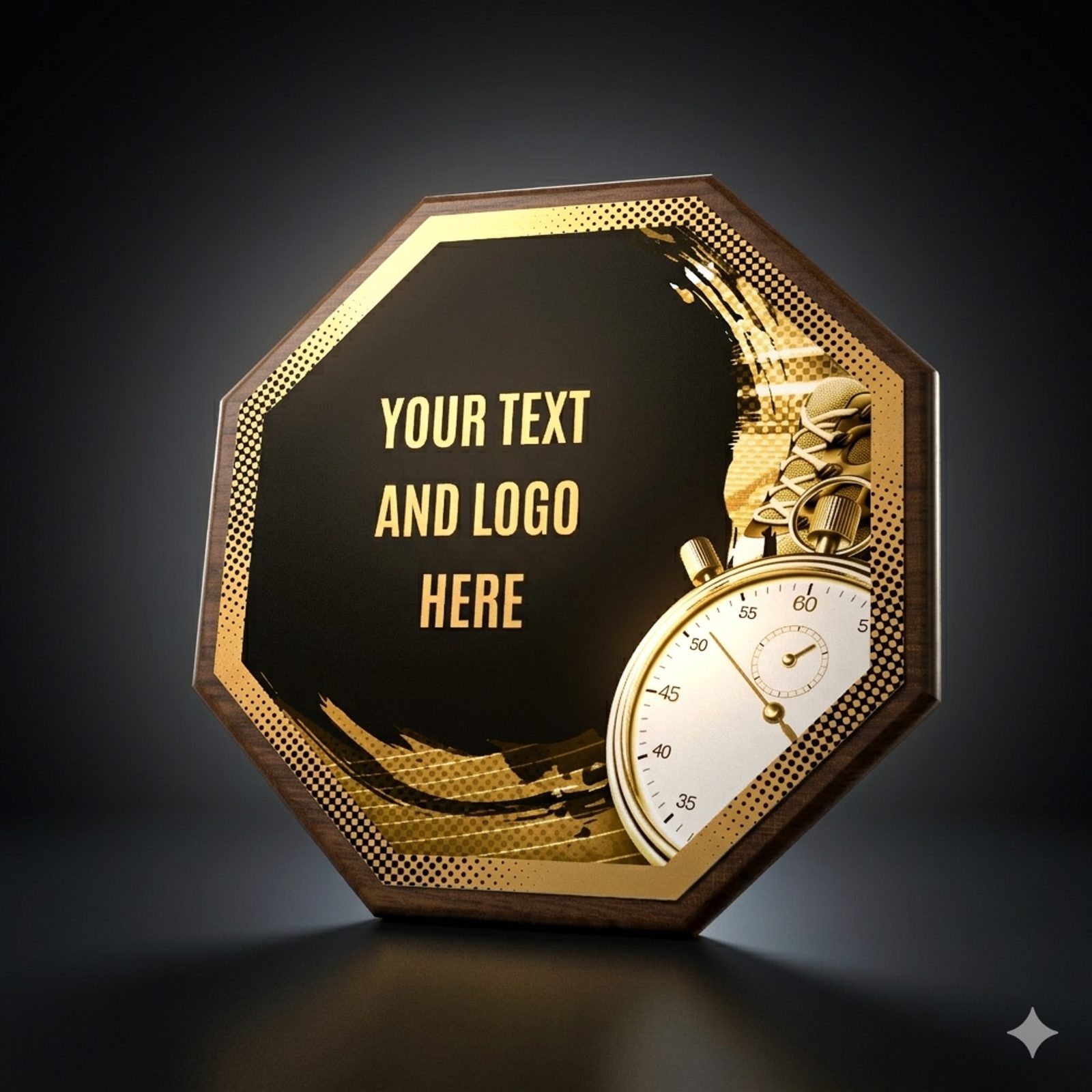 Eine stilvolle Auszeichnung, die eine Holzplakette mit einem Durchmesser von 26 cm und einer Stärke von 1,5 cm mit einem markanten Design-Zentrum (Durchmesser 24 cm) aus Metall kombiniert, veredelt mit UV-Druck und Effektlack.