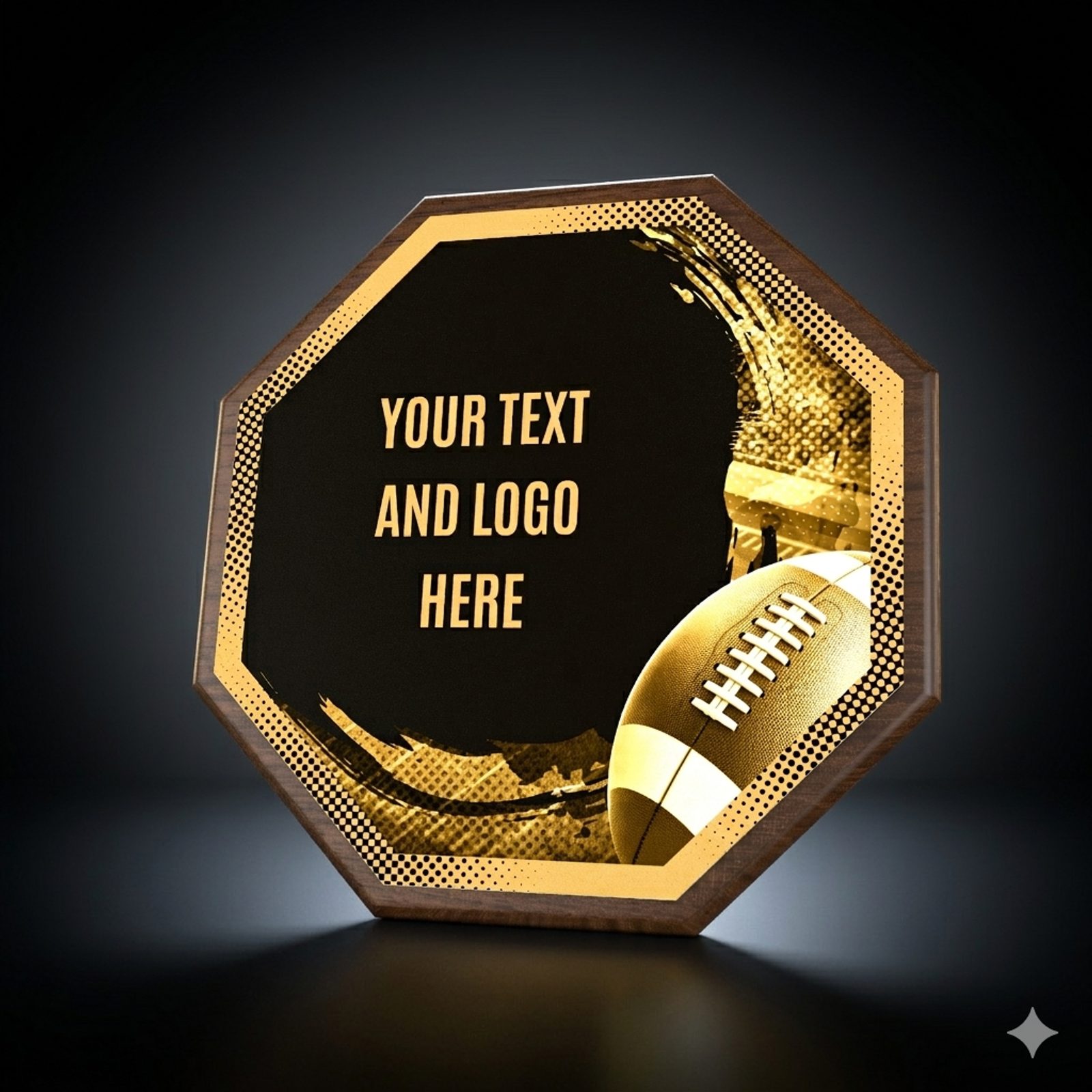 Eine stilvolle Auszeichnung, die eine Holzplakette mit einem Durchmesser von 26 cm und einer Stärke von 1,5 cm mit einem markanten Design-Zentrum (Durchmesser 24 cm) aus Metall kombiniert, veredelt mit UV-Druck und Effektlack.