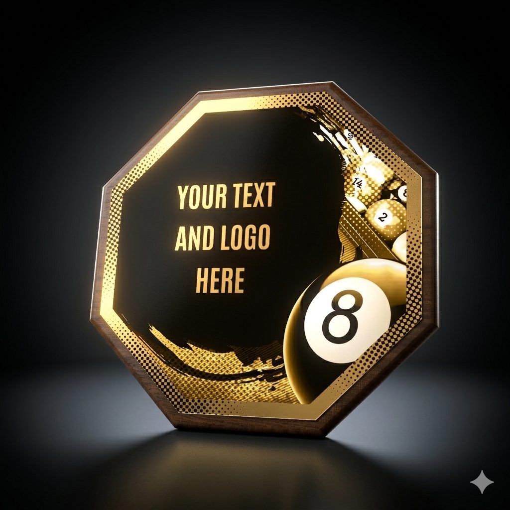 Eine stilvolle Auszeichnung, die eine Holzplakette mit einem Durchmesser von 26 cm und einer Stärke von 1,5 cm mit einem markanten Design-Zentrum (Durchmesser 24 cm) aus Metall kombiniert, veredelt mit UV-Druck und Effektlack.