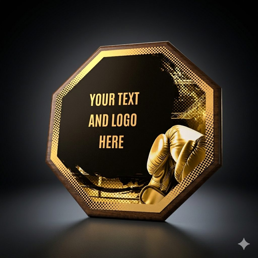 Eine stilvolle Auszeichnung, die eine Holzplakette mit einem Durchmesser von 26 cm und einer Stärke von 1,5 cm mit einem markanten Design-Zentrum (Durchmesser 24 cm) aus Metall kombiniert, veredelt mit UV-Druck und Effektlack.