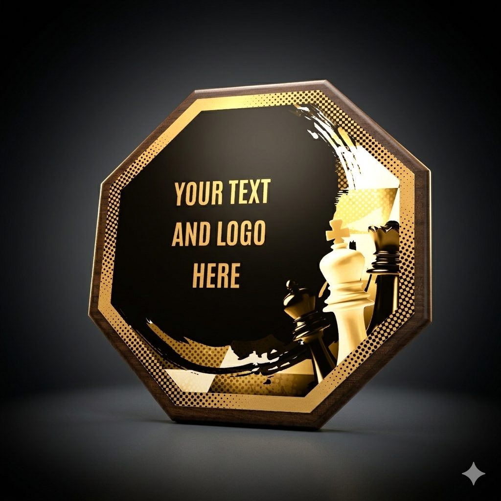 Eine stilvolle Auszeichnung, die eine Holzplakette mit einem Durchmesser von 26 cm und einer Stärke von 1,5 cm mit einem markanten Design-Zentrum (Durchmesser 24 cm) aus Metall kombiniert, veredelt mit UV-Druck und Effektlack.