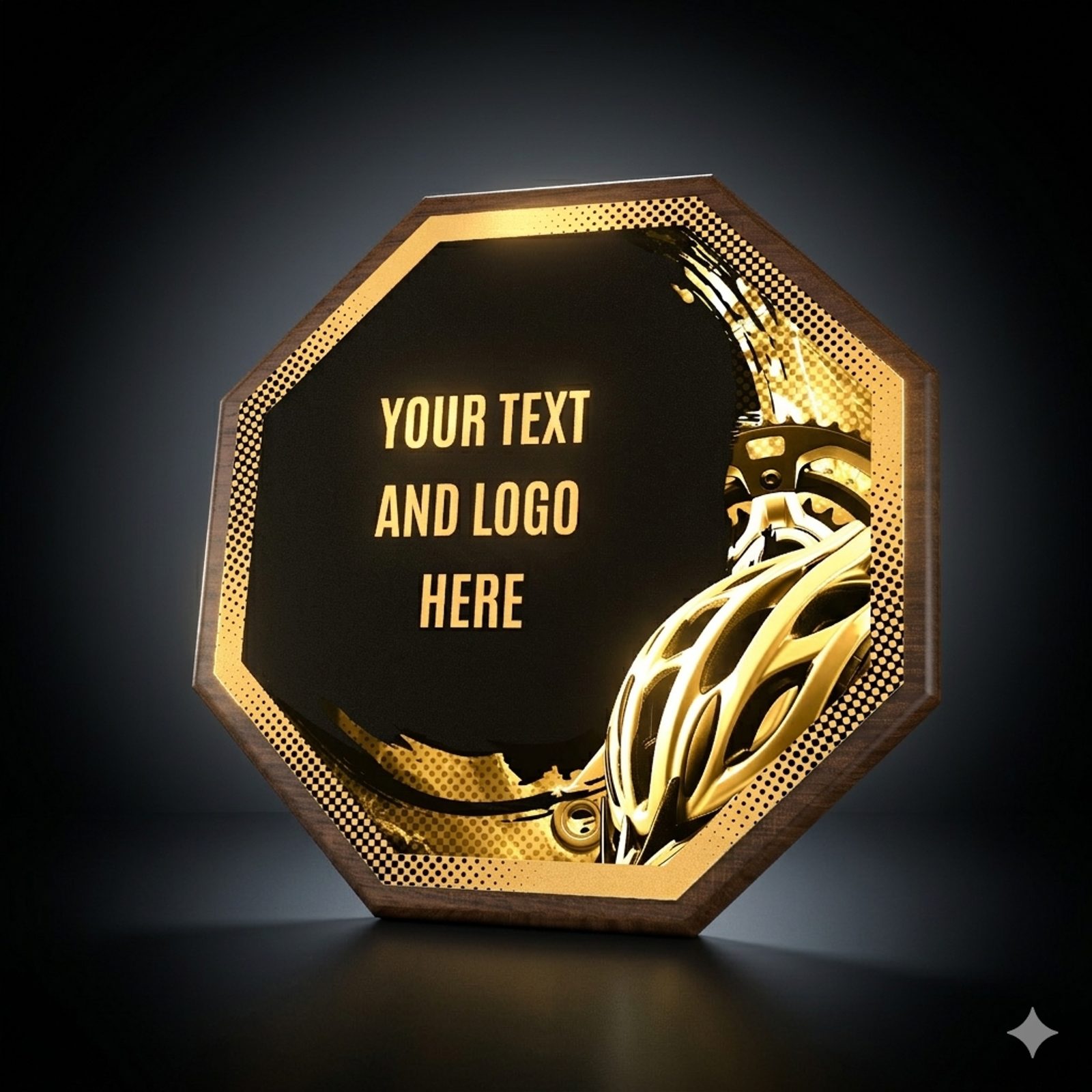 Eine stilvolle Auszeichnung, die eine Holzplakette mit einem Durchmesser von 26 cm und einer Stärke von 1,5 cm mit einem markanten Design-Zentrum (Durchmesser 24 cm) aus Metall kombiniert, veredelt mit UV-Druck und Effektlack.