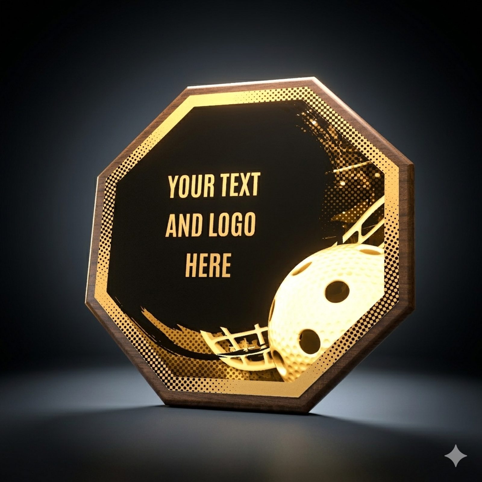 Eine stilvolle Auszeichnung, die eine Holzplakette mit einem Durchmesser von 26 cm und einer Stärke von 1,5 cm mit einem markanten Design-Zentrum (Durchmesser 24 cm) aus Metall kombiniert, veredelt mit UV-Druck und Effektlack.