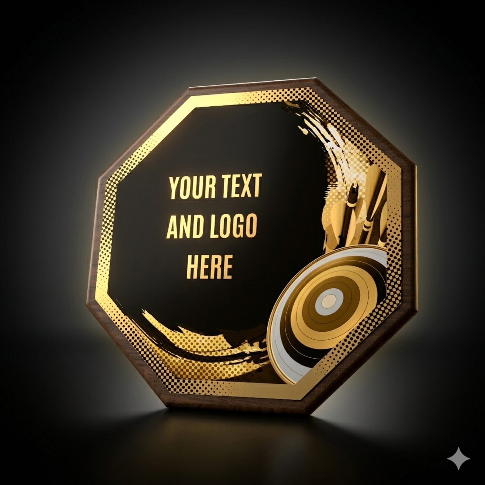 Eine stilvolle Auszeichnung, die eine Holzplakette mit einem Durchmesser von 26 cm und einer Stärke von 1,5 cm mit einem markanten Design-Zentrum (Durchmesser 24 cm) aus Metall kombiniert, veredelt mit UV-Druck und Effektlack.