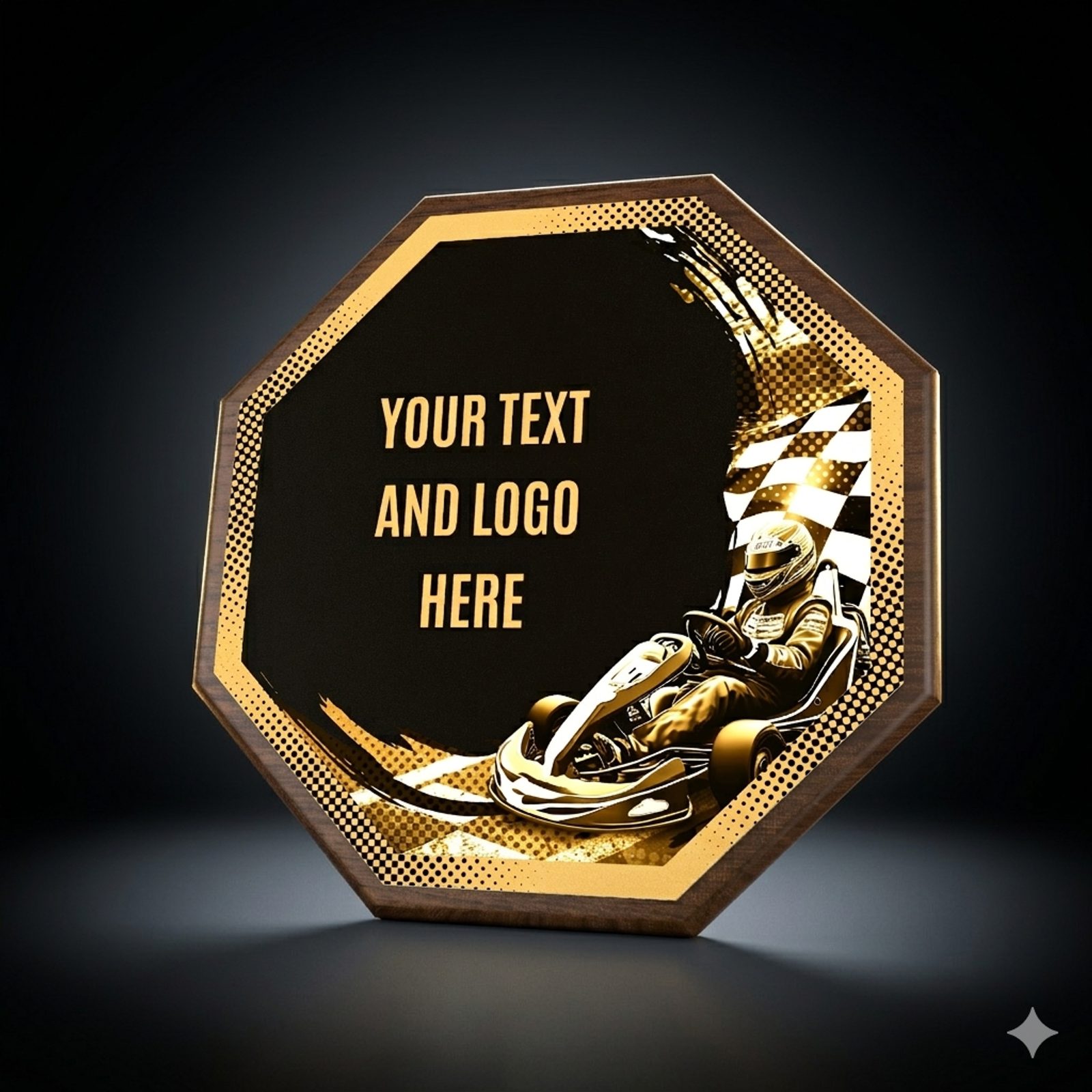 Eine stilvolle Auszeichnung, die eine Holzplakette mit einem Durchmesser von 26 cm und einer Stärke von 1,5 cm mit einem markanten Design-Zentrum (Durchmesser 24 cm) aus Metall kombiniert, veredelt mit UV-Druck und Effektlack.