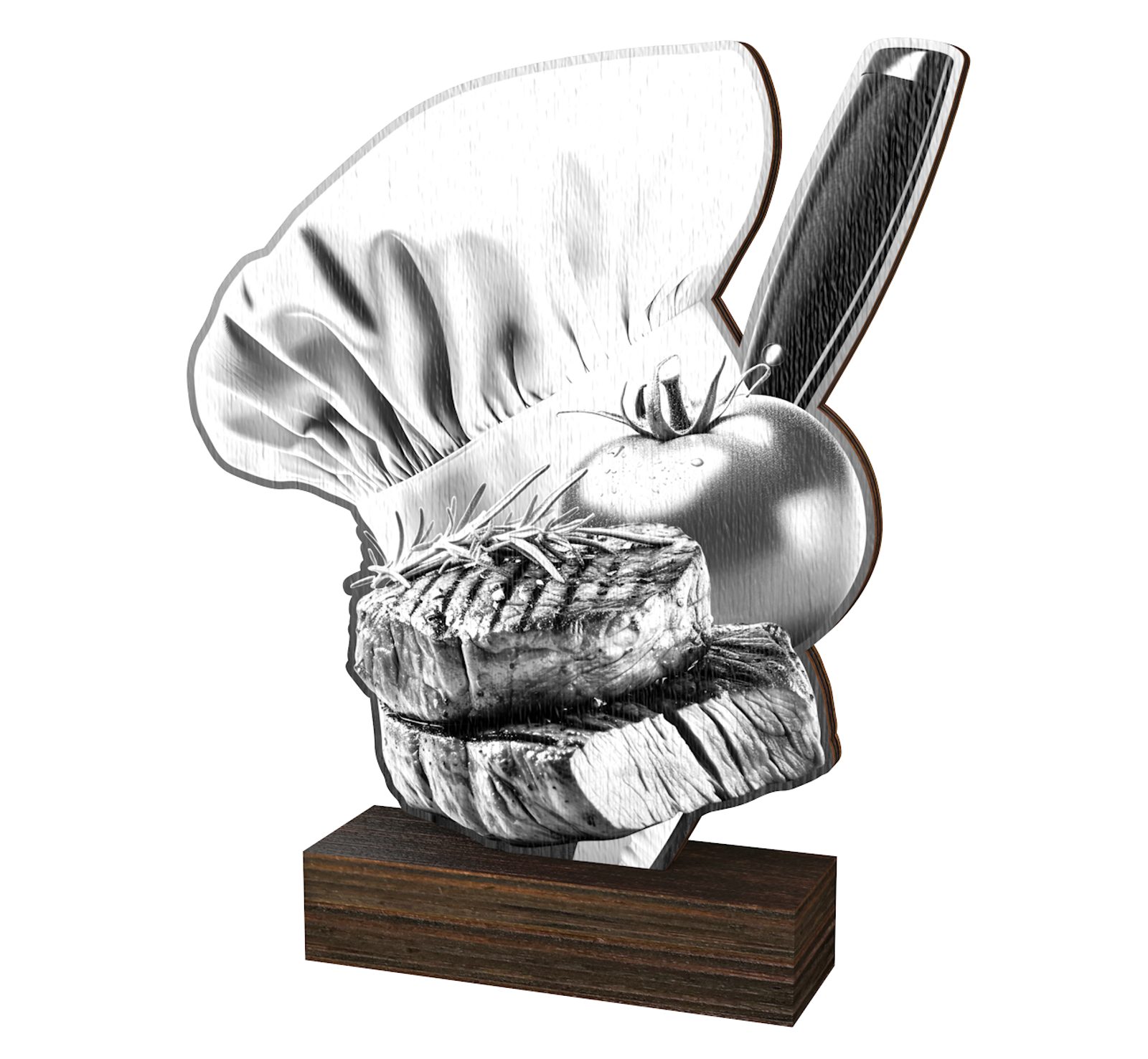 Holzschild aus Birkensperrholz - 8 mm Trophäe - 27 mm Basis Auf dem Sockel kann ein Metall Schildchen angebracht werden. Der Preis des Schildchens ist nicht im Pokalpreis enthalten.