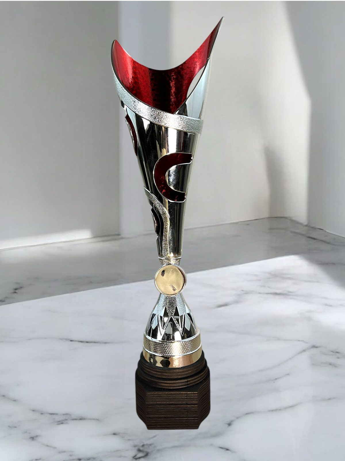 Auf dem Pokal kann ein Etikett und ein Emblem angebracht werden, dies ist nicht im Preis des Pokals enthalten.